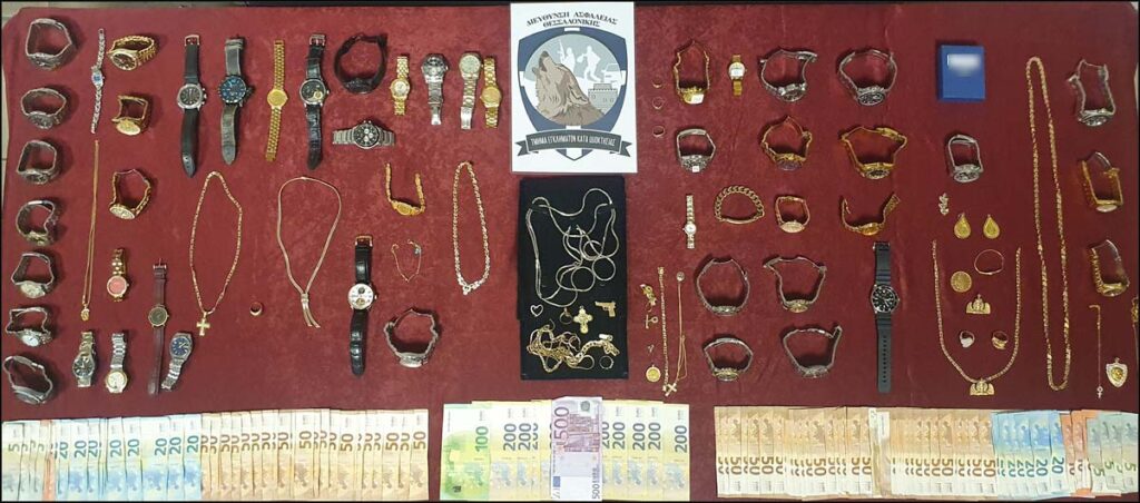 Κατά τη διάρκεια των επιχειρήσεων που πραγματοποιήθηκαν σε 34 οικίες, βρέθηκαν και κατασχέθηκαν το συνολικό χρηματικό ποσό των (12.780,00) ευρώ, (42) ανδρικά και γυναικεία ρολόγια χειρός, (50) χρυσαφικά – τιμαλφή διαφόρων ειδών (σκουλαρίκια, δακτυλίδια κτλ), μια χρυσή λίρα Αγγλίας, (06) κονσόλες ηλεκτρονικών παιχνιδιών, συσκευές κινητής τηλεφωνίας και πακέτα τηλεφωνικής σύνδεσης, δυο πιστόλια κρότου αερίου, (47) φυσίγγια κρότου, ένα (01) δίκαννο κυνηγετικό όπλο με κομμένες τις κάννες, ένας φορητός πομποδέκτης συντονισμένος στις συχνότητες της ΕΛ.ΑΣ και μικροποσότητα ακατέργαστής κάνναβης.